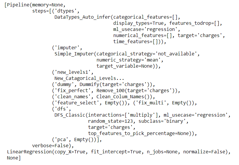 When you save a model in PyCaret, the entire transformation pipeline based on the configuration defined in the **setup() **function is created. All inter-dependencies are orchestrated automatically. See the pipeline and model stored in the ‘deployment_28042020’ variable: