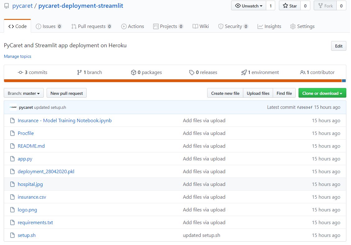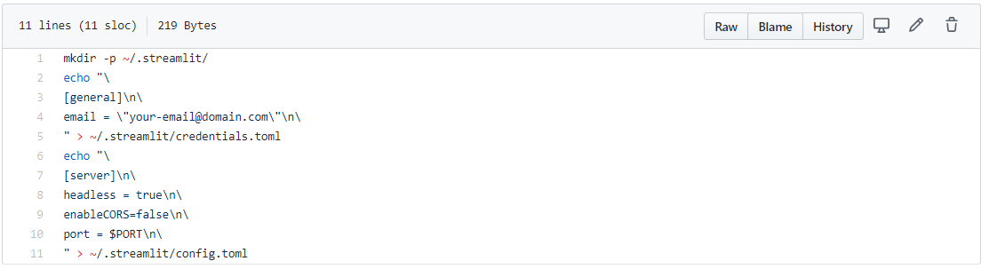 Procfile is simply one line of code that provides startup instructions to the web server that indicate which file should be executed when an application is triggered. In this example, ‘Procfile’ is used for executing **setup.sh **which will create the necessary environment for the streamlit app and the second part “streamlit run app.py” is to execute the application (this is similar to how you would execute a streamlit application on your local computer).