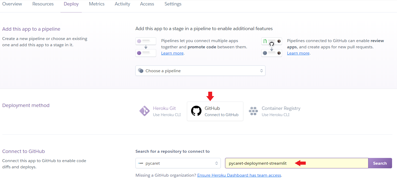 Now that the model is trained, the machine learning pipeline is ready, and the application is tested on our local machine, we are ready to start our deployment on Heroku. There are a couple of ways to upload your application source code onto Heroku. The simplest way is to link a GitHub repository to your Heroku account.