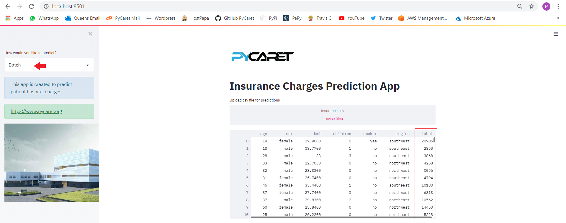 This part deals with the second functionality i.e. prediction by batch. We have used the file_uploader widget of streamlit to upload a csv file and then called the native **predict_model() **function from PyCaret to generate predictions that are displayed used streamlit’s write() function.