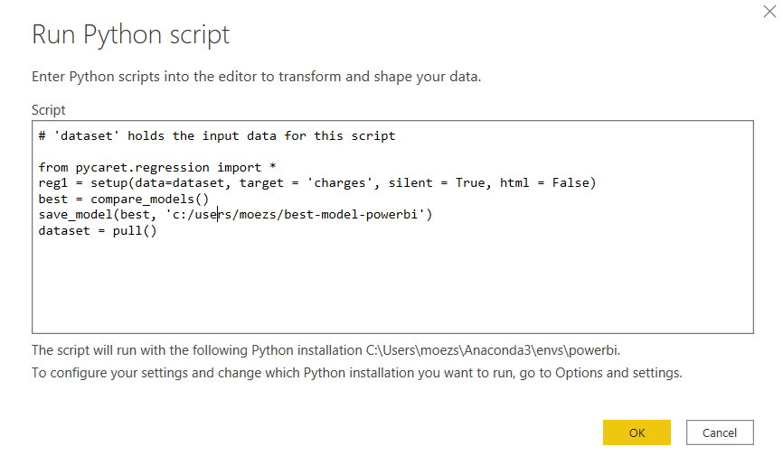 Before we start using PyCaret’s machine learning capabilities in Power BI we need to create a virtual environment and install pycaret. This is a three-step process:
