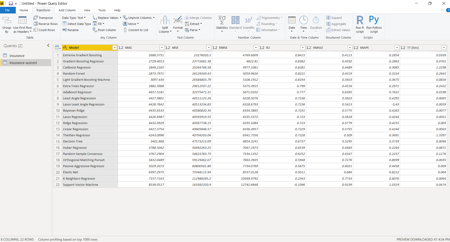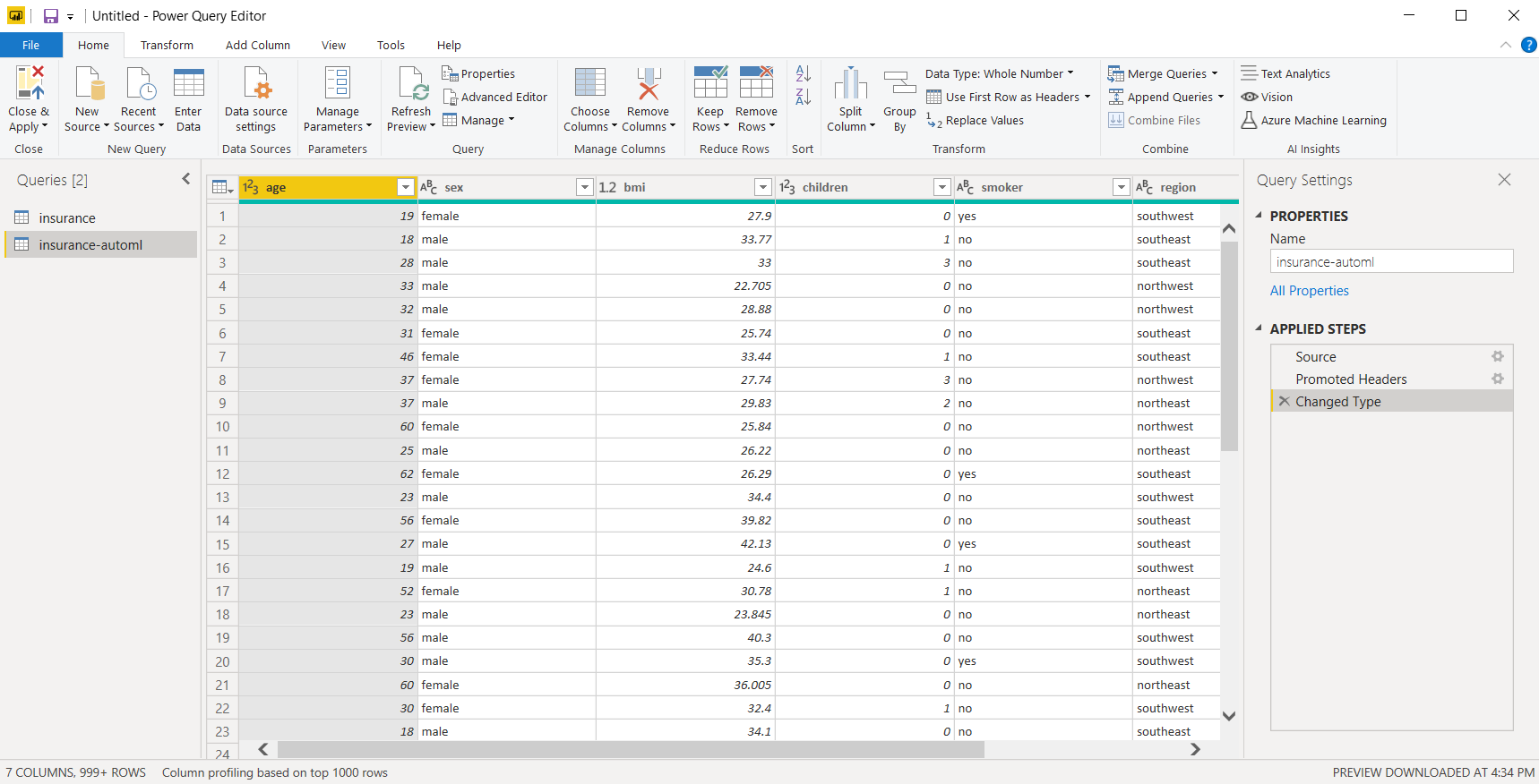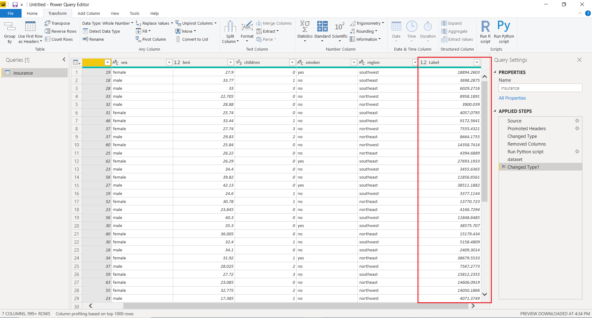 For demonstration purposes, we will load the same dataset again and remove the ‘charges’ column from the dataset. Execute the following code as a Python script in Power Query to get the predictions: