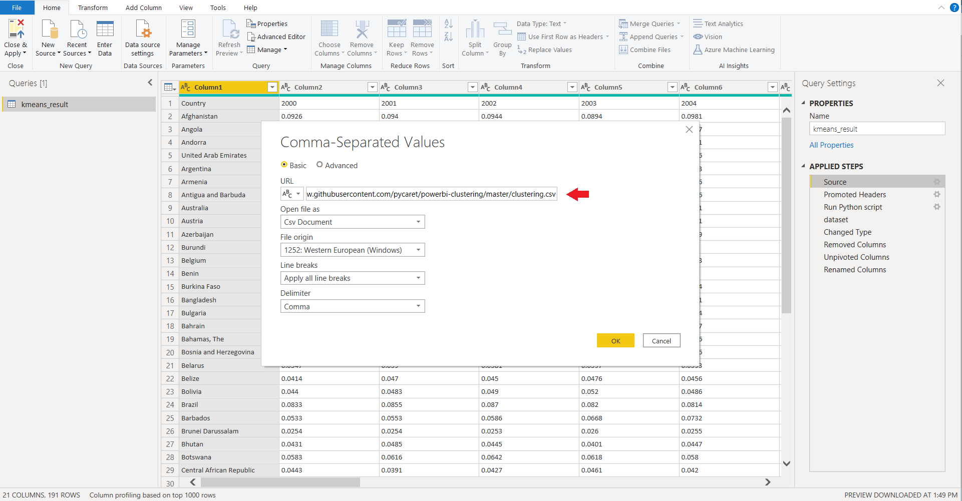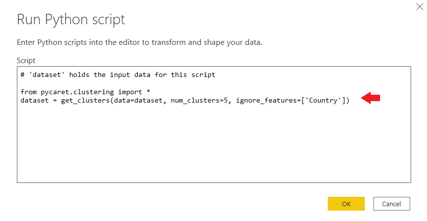 To train a clustering model in Power BI we will have to execute a Python script in Power Query Editor (Power Query Editor → Transform → Run python script). Run the following code as a Python script: