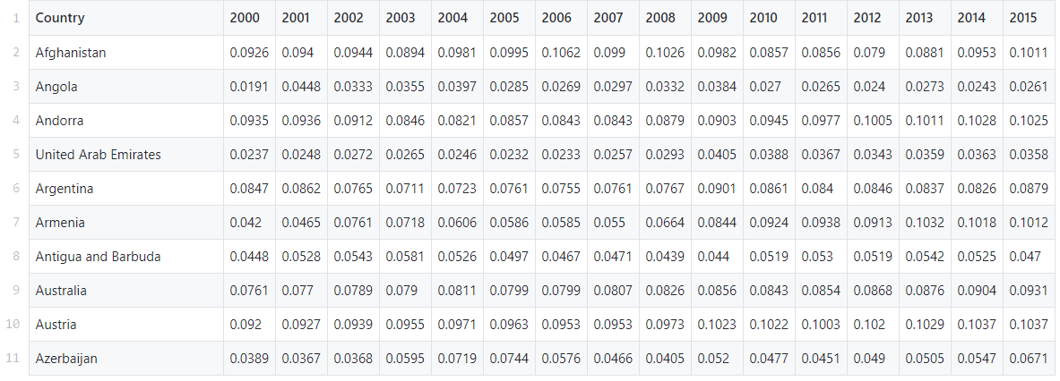 In this tutorial we will use the current health expenditure dataset from the World Health Organization’s*** ***Global Health Expenditure database. The dataset contains health expenditure as a % of National GDP for over 200 countries from year 2000 through 2017.