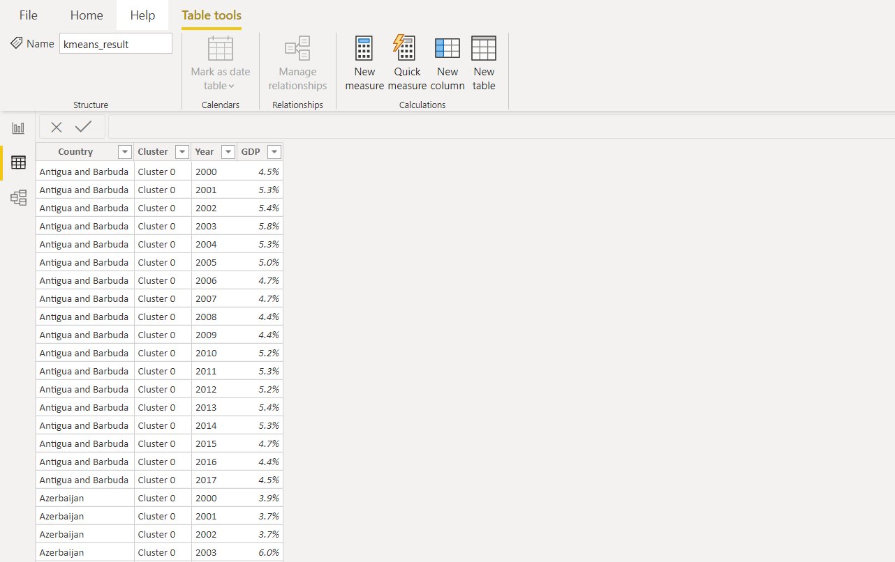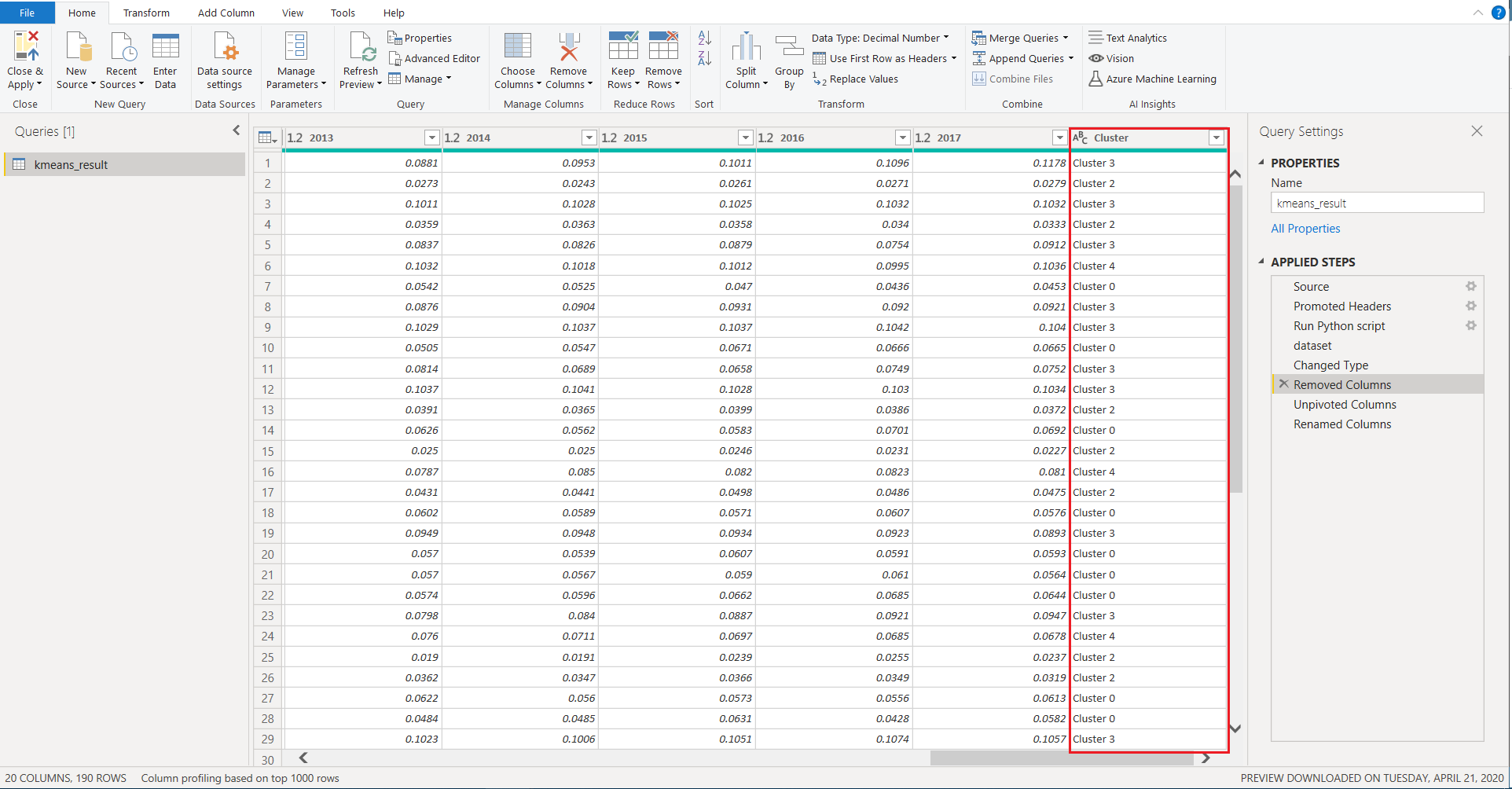 A new column which contains the cluster label is attached to the original dataset. All the year columns are then *unpivoted *to normalize the data so it can be used for visualization in Power BI.