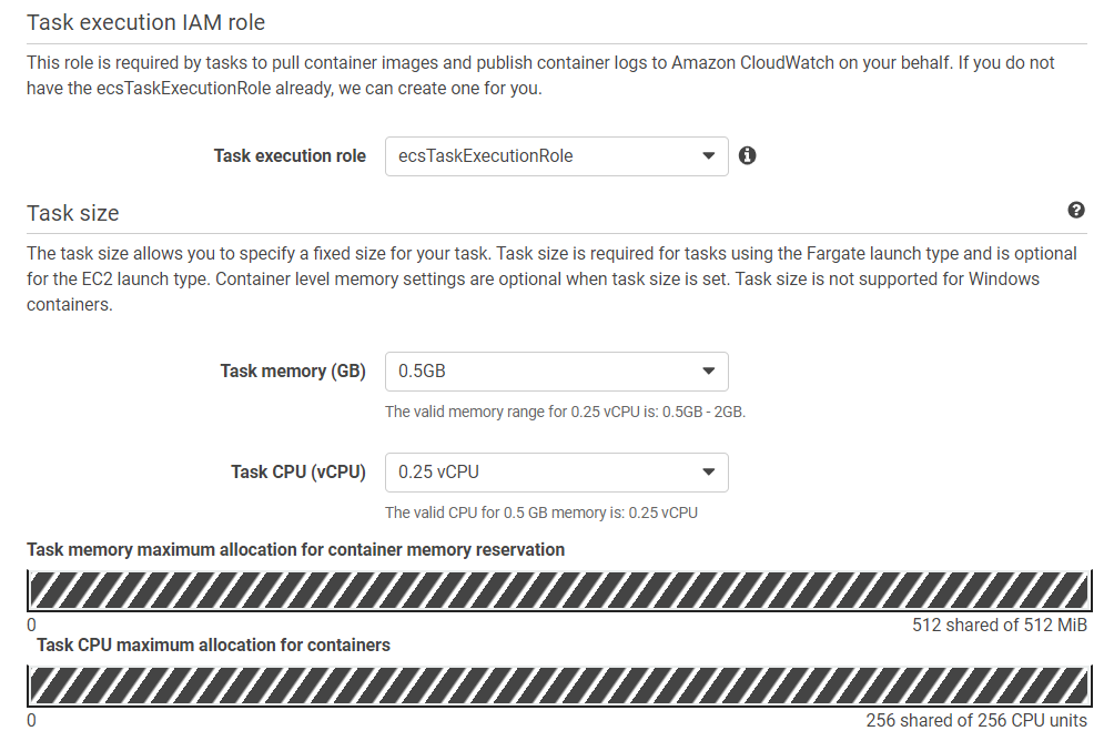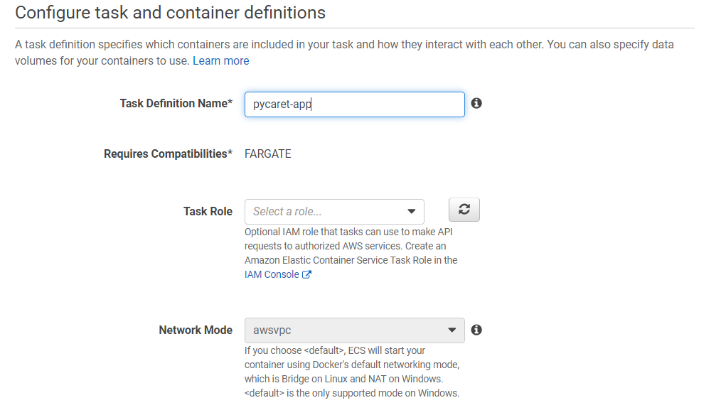 A task definition is required to run Docker containers in Amazon ECS. Some of the parameters you can specify in a task definition include: The Docker image to use with each container in your task. How much CPU and memory to use with each task or each container within a task.