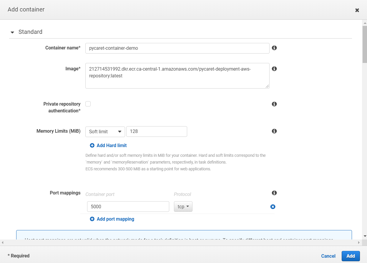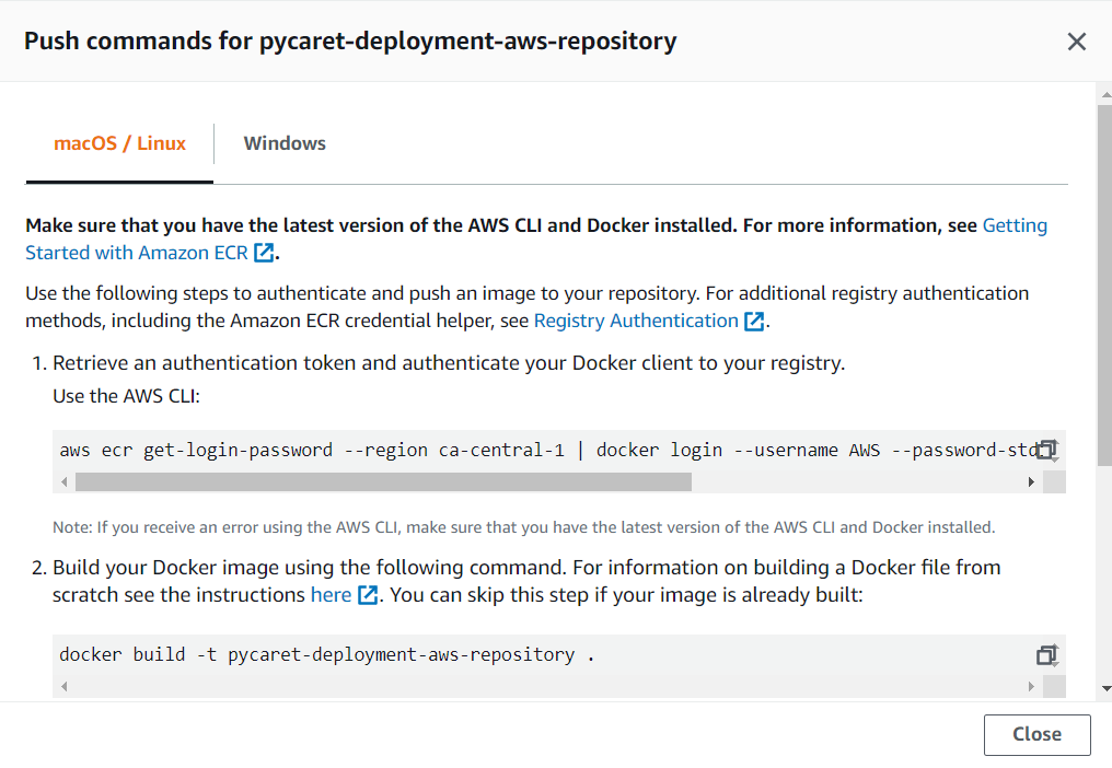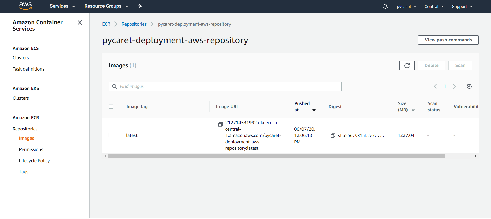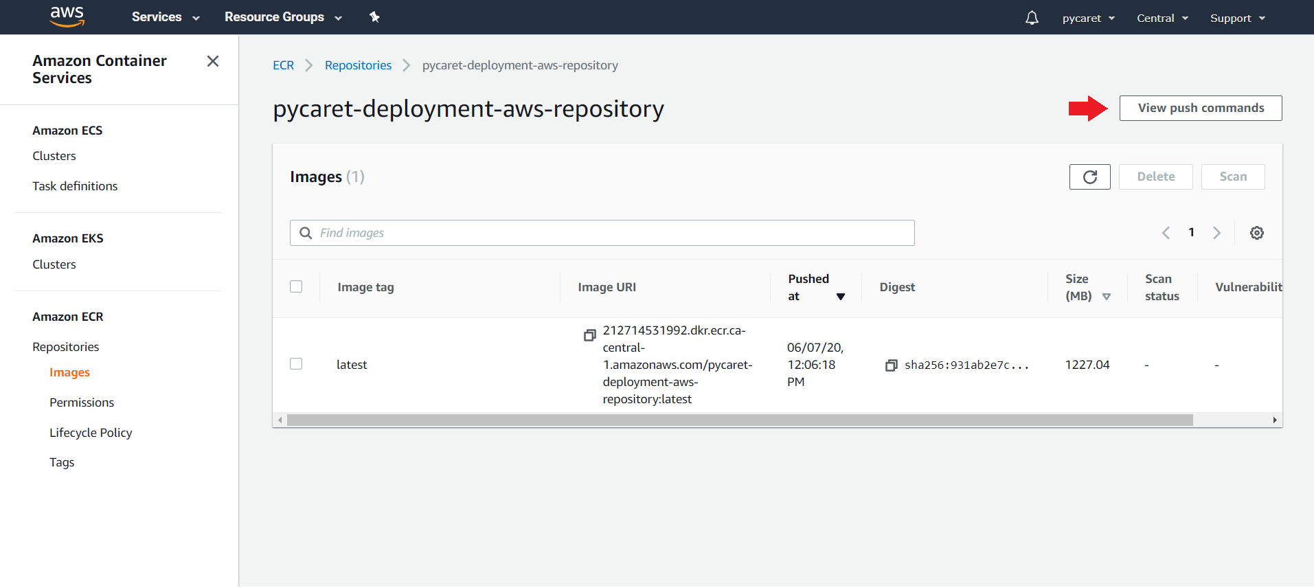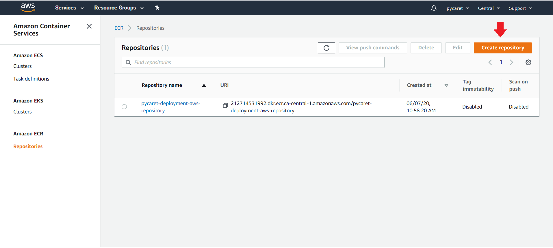 For this demo we have created ‘pycaret-deployment-aws-repository’.