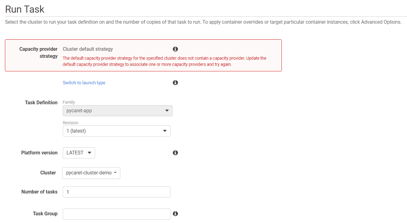 (a) Click on “Switch to launch type” to change the type to Fargate: