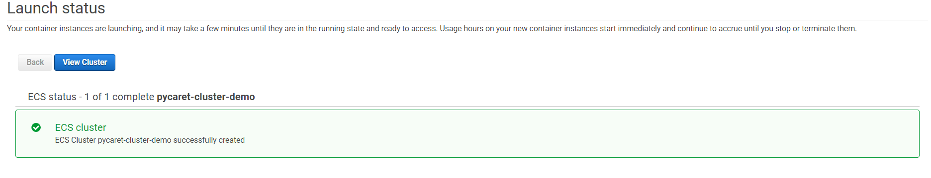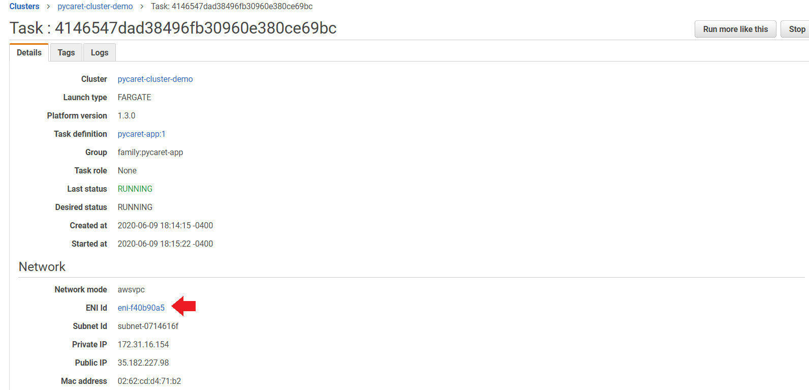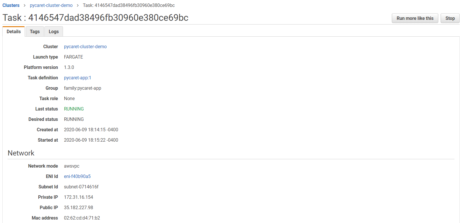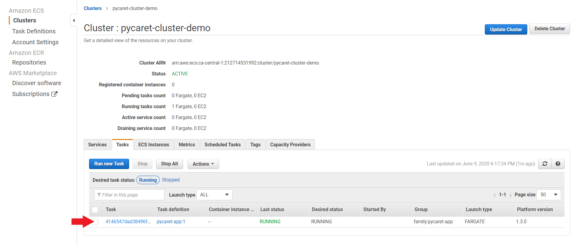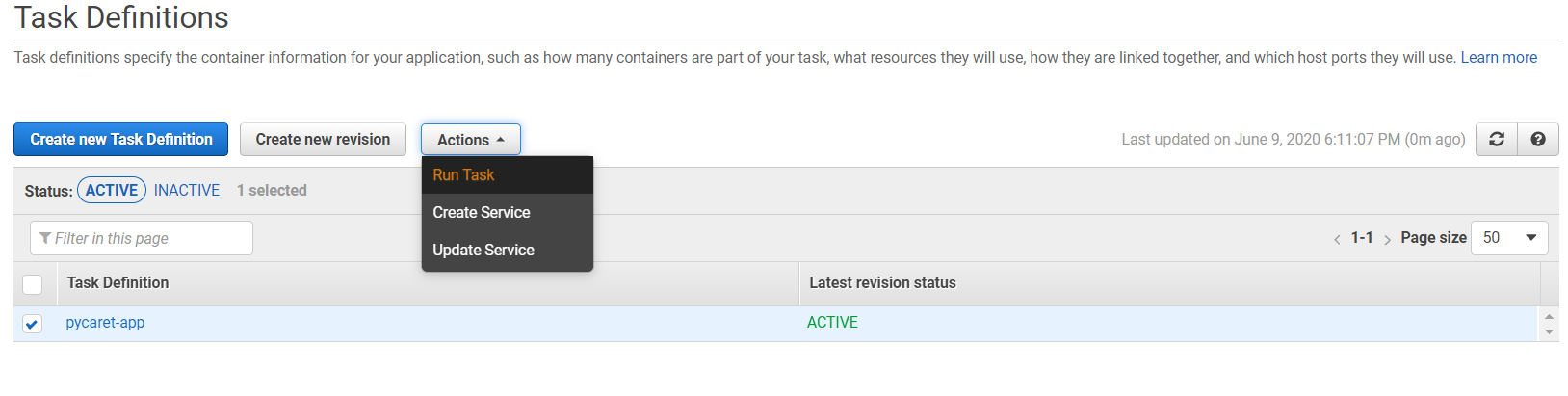 In step 7 we created a task that will start the container. Now we will execute the task by clicking “Run Task” under Actions.