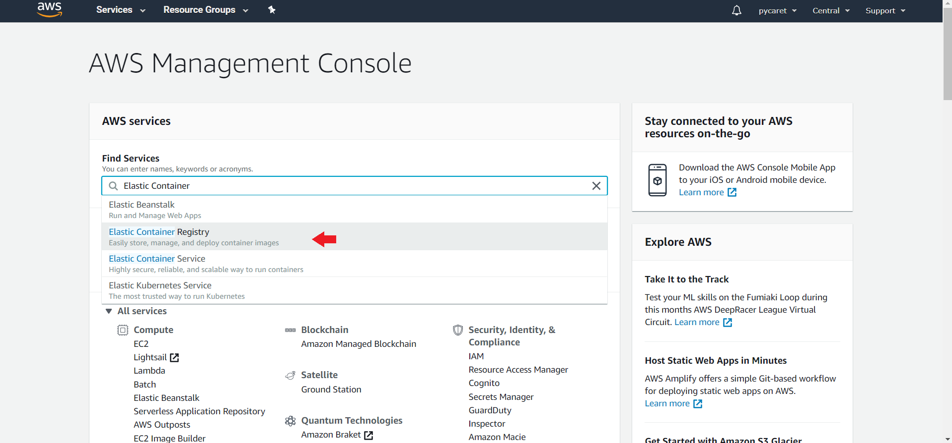 (a) Login to your AWS console and search for Elastic Container Registry: