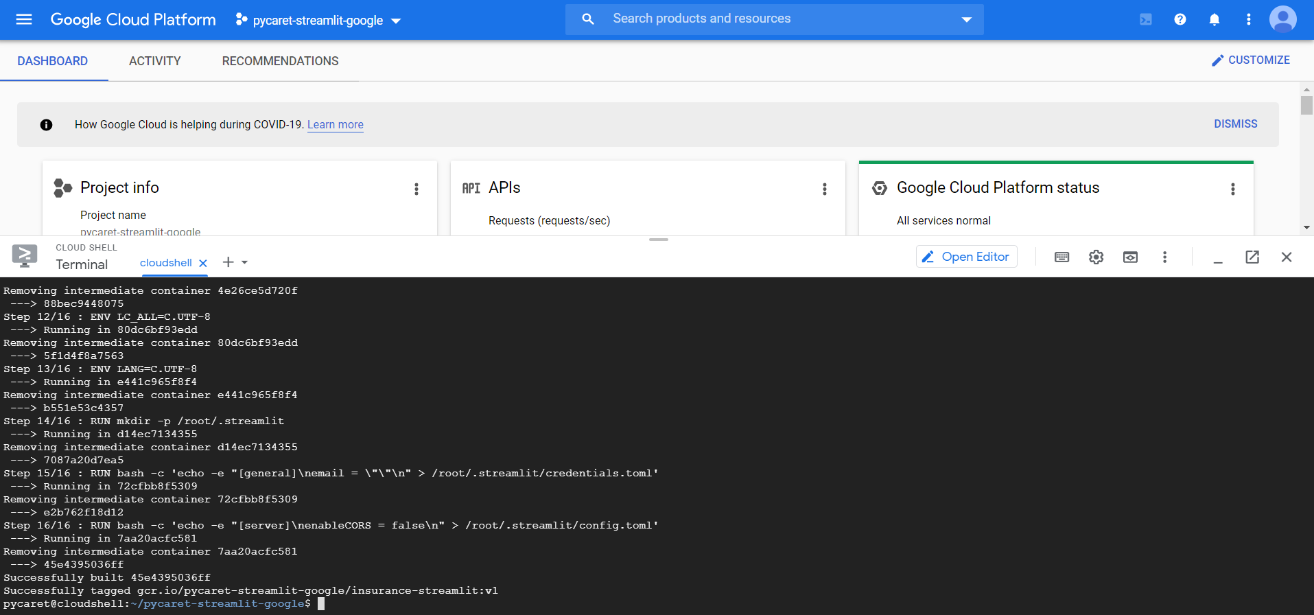 pycaret-streamlit-gcp is the name of the project we chose in step 1 above.