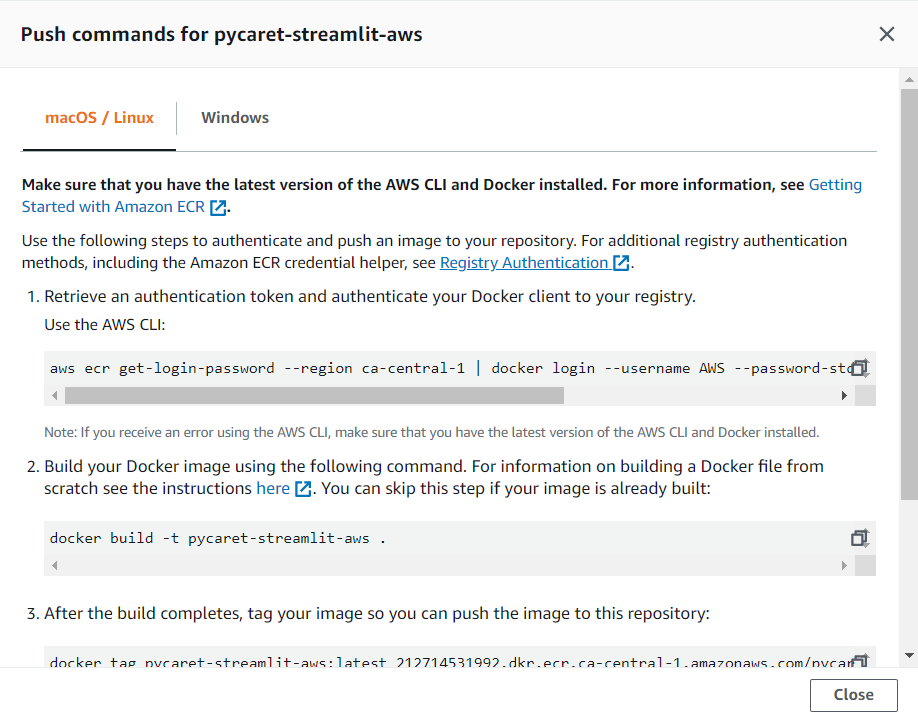 Navigate to your project folder using Anaconda Prompt and execute the commands you have copied in the step above. You must be in the folder where the Dockerfile and the rest of your code reside before executing these commands.
