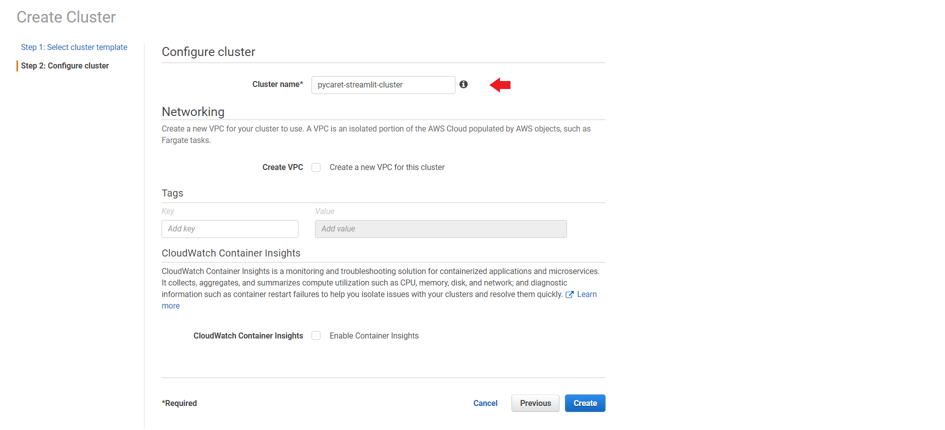 (c) Configure Cluster (Enter cluster name) and click on Create: