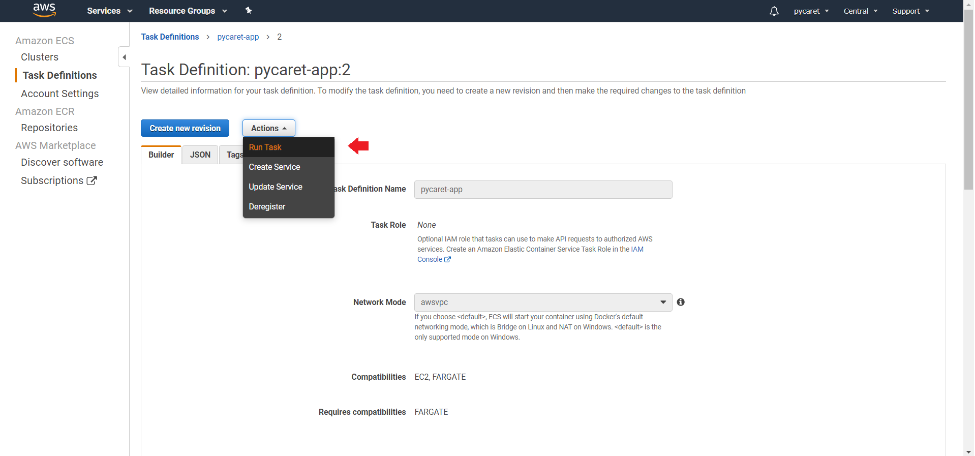 In last step we created a task that will start the container. Now we will execute the task by clicking “Run Task” under Actions.