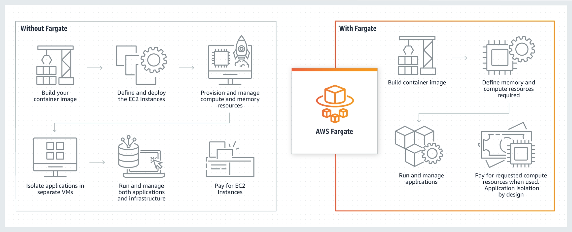 Fargate allocates the right amount of compute, eliminating the need to choose instances and scale cluster capacity. You only pay for the resources required to run your containers, so there is no over-provisioning and paying for additional servers.