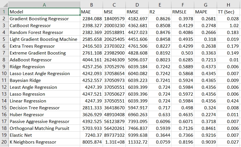 These are the cross-validated metrics for all the models. The best model, in this case, is Gradient Boosting Regressor.