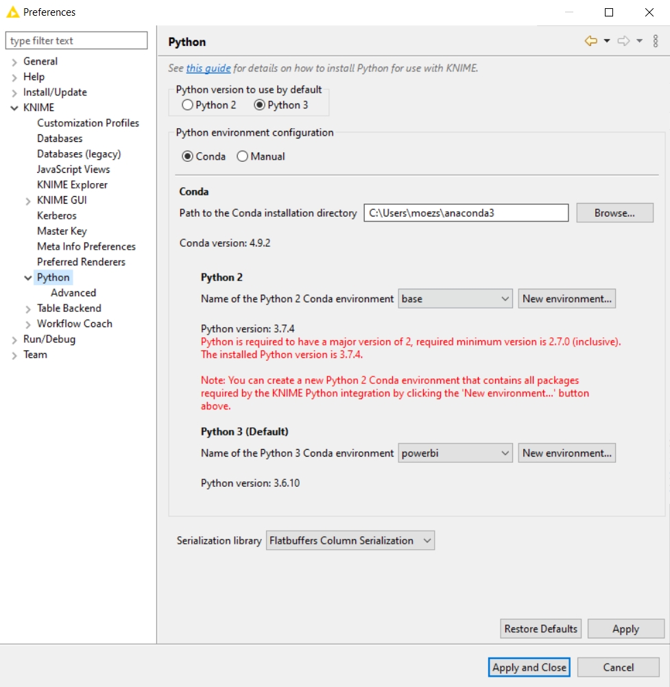 Once installation completes, go to File → Preferences → KNIME → Python and select your Python 3 environment. Notice that in my case the name of the environment is “powerbi”. If you have followed the commands above, the name of the environment is “knimeenv”.
