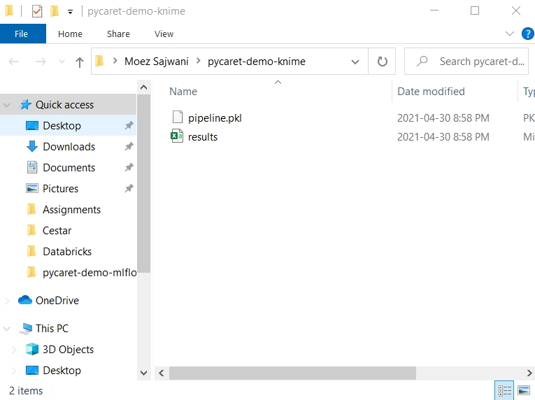 When you successfully execute this workflow, you will generate pipeline.pkl and results.csv file in the defined folder.