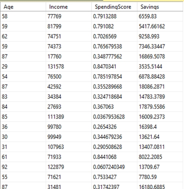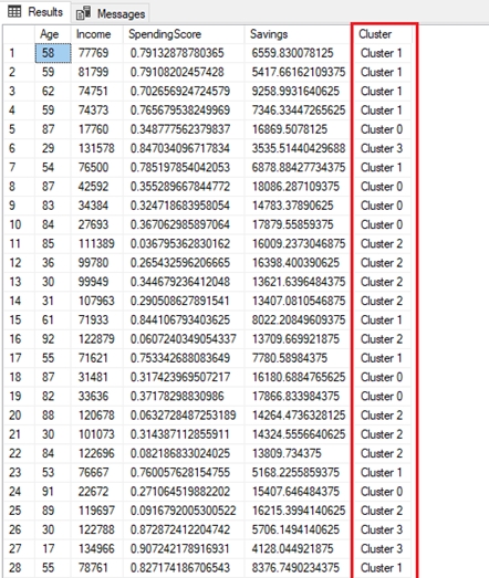 WITH RESULT SETS(([Age] INT, [Income] INT, [SpendingScore] FLOAT, [Savings] FLOAT, [Cluster] varchar(15)));2. Output