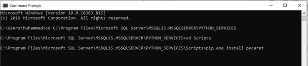C:\Program Files\Microsoft SQL Server\MSSQL15.MSSQLSERVER\PYTHON_SERVICESNavigate to “Scripts” directory and use pip command to install PyCaret package