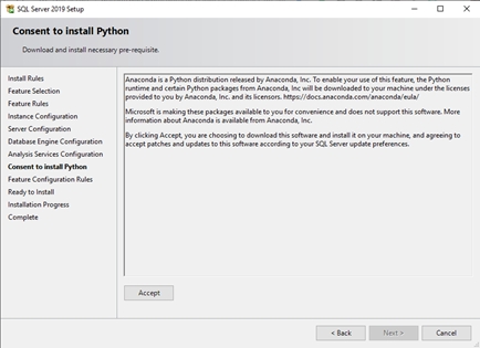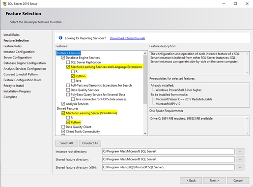 In the Instance Features option, select the features including “Python” under Machine Learning Services and Language Extensions and Machine Learning Server (Standalone)