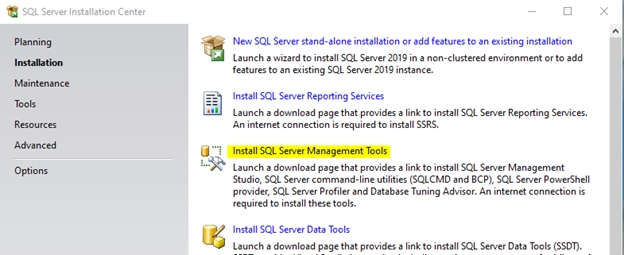 **Click here** or Open SQL Server Installation Center to download “SQL Server Management Tools” file “SSMS-Setup-ENU.exe”