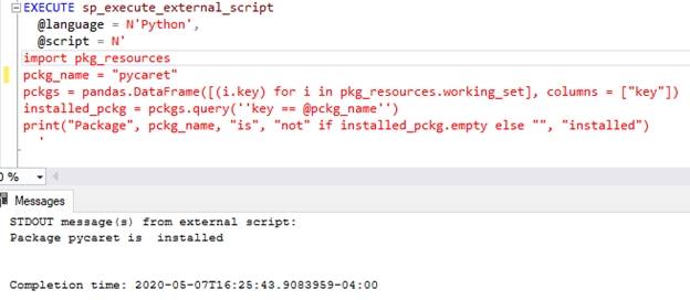 pip.exe install lightgbmExecute the following SQL to verify the PyCaret installation from SQL Server: