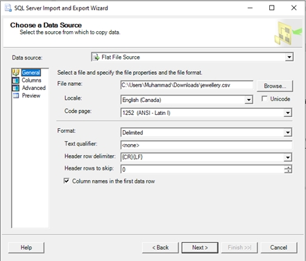 For Data Source, select Flat File Source. Then use the Browse button to select the CSV file. Spend some time configuring the data import before clicking the **Next **button.