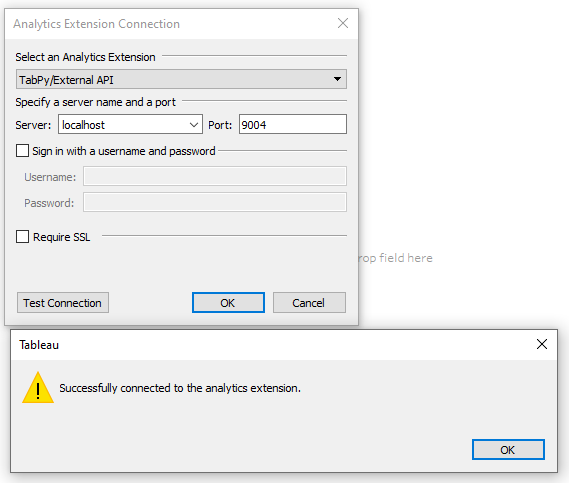 To connect Tableau to the TabPy server go to Help > Settings and Performance > Manage Analytics Extension Connection. Select TabPy and enter localhost, port 9004 (default) and test connection.