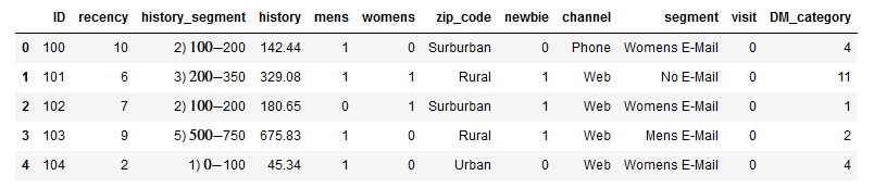 X_pred = pd.DataFrame({'recency':_arg1, 'history_segment':_arg2, 'history':_arg3, 'mens':_arg4, 'womens':_arg5,'zip_code':_arg6, 'newbie':_arg7, 'channel':_arg8, 'segment':_arg9, 'DM_category':_arg10})