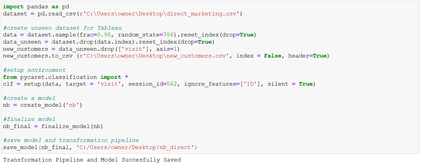 A more appropriate approach is to use a pre-trained model in Tableau to generate predictions on new data. Jupyter notebook will be used in this example to demonstrate how PyCaret is used to make this process straight forward.