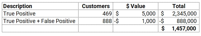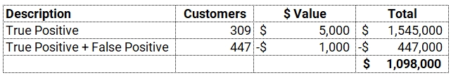 Using these assumptions and the confusion matrix above, we can calculate the $ impact of this model: