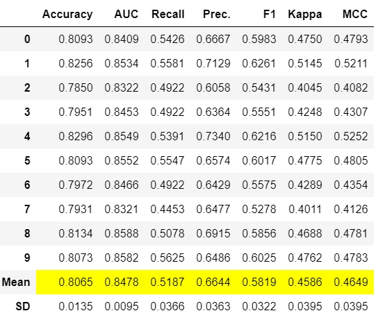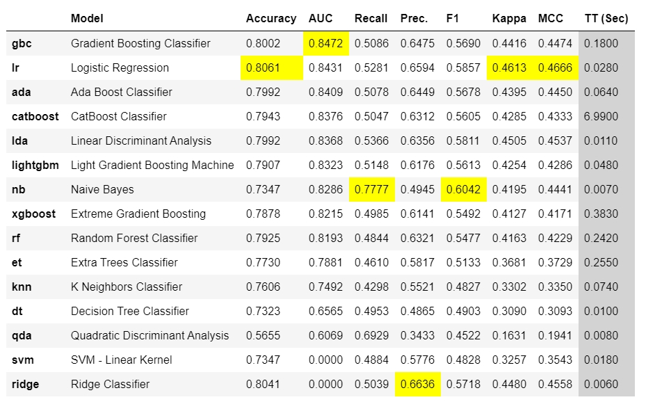 Now that data preparation is done, let’s start the training process by using compare_models functionality. This function trains all the algorithms available in the model library and evaluates multiple performance metrics using cross-validation.