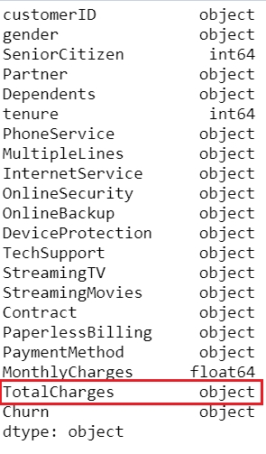 Notice that TotalCharges is of an object type instead of float64. Upon investigation, I figured out there are some blank spaces in this column which has caused Python to force the data type as object . To fix that, we will have to trim blank spaces before changing the data type.