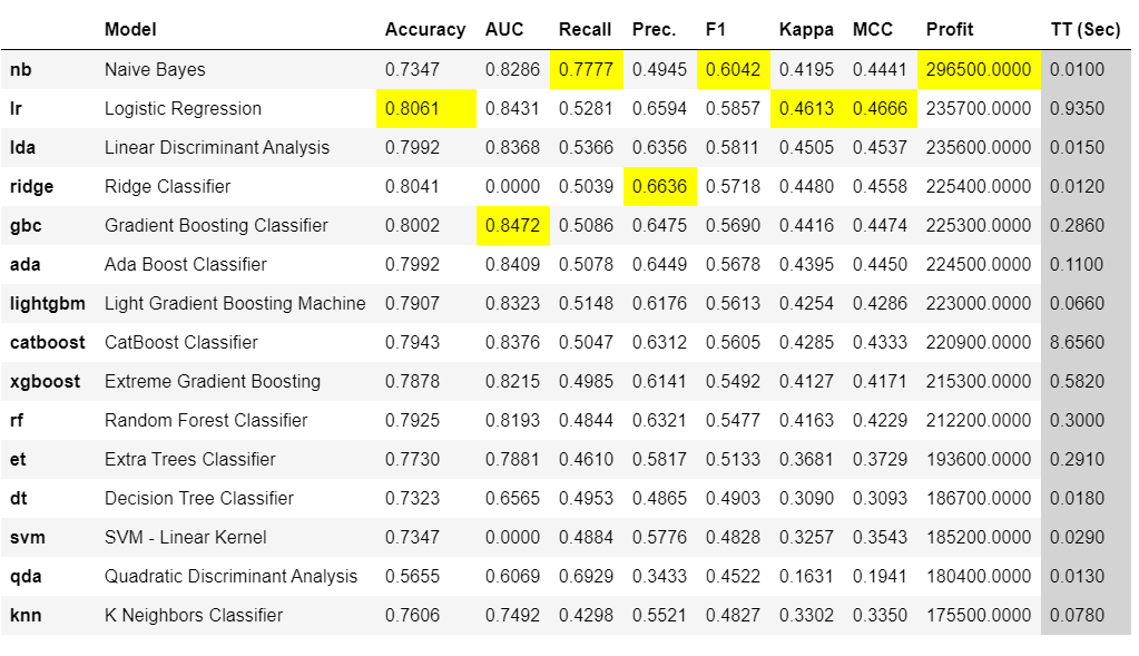 ***BAM! *We have just increased profit by ~$400,000 with a model that does 2% less in AUC than the best model. How does this happen? Well, for starters, AUC or any other out-of-the-box classification metric (Accuracy, Recall, Precision, F1, Kappa, etc.) is not a business-smart metric, so it does not take into account the risk and reward proposition. Adding a custom metric and using it for model selection or optimization is a great idea and right way to go with.