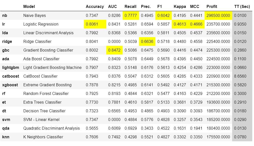 Notice that a new column Profit is added this time and surprisingly Naive Bayes which is a pretty bad model in terms of AUC is the best model when it comes to profit. Let’s see how: