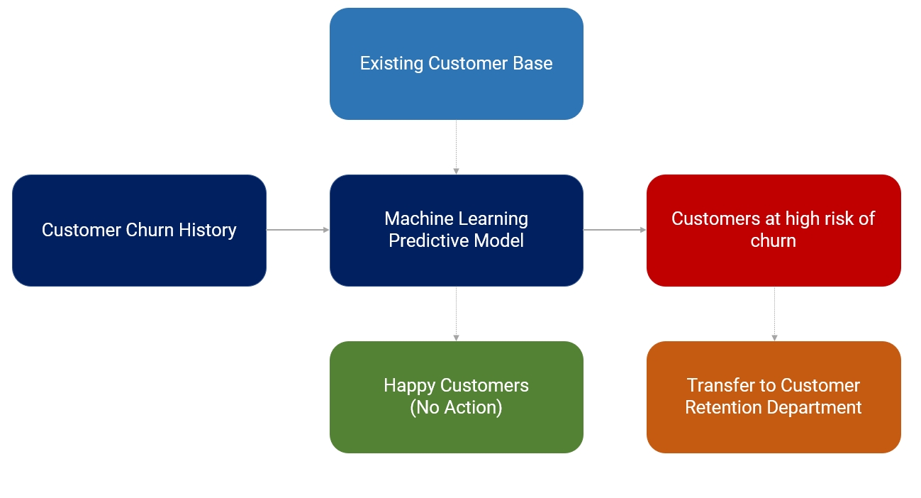 Now that you understand how the data is sourced and churn target is created (which is one of the most challenging parts of the problem), let’s discuss how this machine learning model will be used in the business. Read the below diagram from left-to-right:
