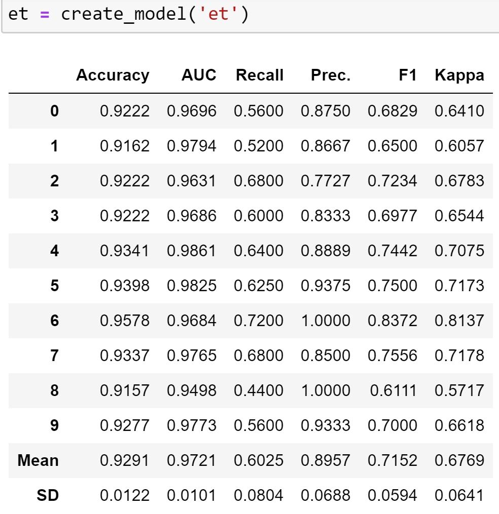Once we have the top four models which we would want to pursue further, we need to find the best hyperparameters for the models. PyCaret has a very convenient function of ***tune_model() ***which loops through pre-defined hyper-parameter grids to find the best parameters for our model through 10 fold cross-validation. PyCaret uses the standard Randomized-Grid search to iterate through the parameters. The number of iterations (n_iter) can be specified to a high number based on compute capacity and time constrain. Within the tune_function(), PyCaret also allows us to specify the metric we want to optimize. The default is Accuracy, but we can choose other metrics as well. Like we would choose Recall here since it is the metric we would want to increase/optimize.