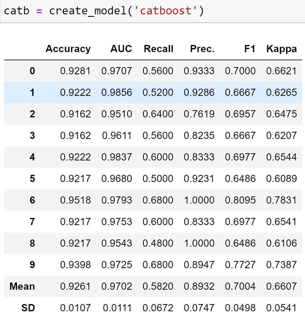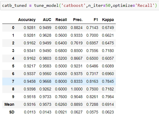 The code above tunes the Cat-Boost classifier to optimize **‘Recall’ **by iterating 50 times over the defined grid and displays the 6 metrics for each fold. We see that Mean Recall has improved from 58.2% in base Cat-Boost to 62.6% here. This is a massive jump, not so common at the tuning stage. However, it still remains lower than 66.6% of base ‘mlp’ that we created earlier. For the other three models, we did not see improvement in performance by tuning (example in the notebook). The reason being the random nature of iterating through the parameters. There however would exist a parameter that would equal or exceed the performance of the base model, but for that, we need to increase n_iter even more, which means more compute time.