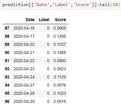 Looking at the Label and Score column of the prediction, the model did not predict a significant fall on any of the days. For example, given the historical returns as of 29th April, the model predicts that a significant fall in Gold Prices over the next 22-Day period is not likely, hence Label = 0, with a probability of a meagre 9.19%.