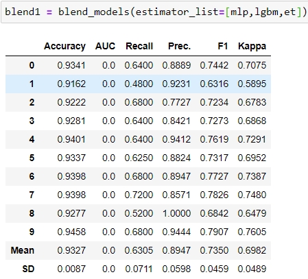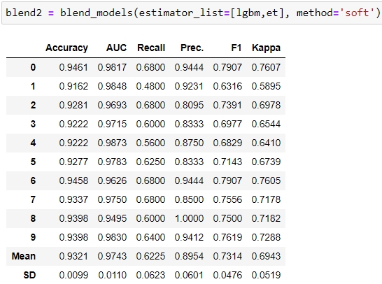 Blending models is basically building a voting classifier on top of estimators. For models that provide prediction probability, we can use soft voting (using their probabilities), while for others, we would use hard-voting. The blend_model() function defaults to using hard voting, which can be changed manually. I built two blends to see if there was some additional performance that can be extracted.
