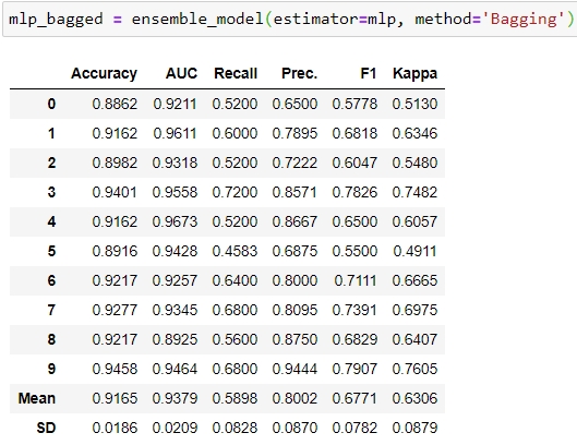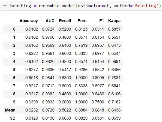 After having tuned the hyper-parameters of the model, we can try Ensembling methods to improve performance. Two ensembling methods we can try is ‘Bagging’ and ‘Boosting’ . Models that do not provide probability estimates cannot be used for Boosting. Hence, we can use Boosting with ‘lgbm’ and ‘et’ only. For others, we tried bagging to see if there were any improvements in performance or not. Below are the code snapshots and the 10-fold results.