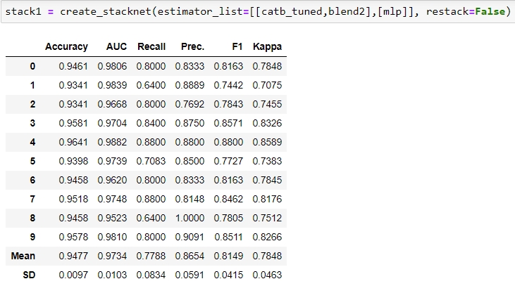 The stack above, ‘stack3, had most resounding success with Recall averaging 80.7%, i.e 14% higher than our winner ‘mlp’ model without sacrificing on Accuracy (95%, an improvement of 3%), AUC (97.34%, an improvement of 2.5%) or Precision (86.28%, improvement of massive 7.7%)