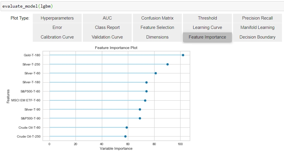 We can see that Return of Gold in the past 180 days is the most important factor here. This is also intuitive because if the Gold prices have increased a lot in the past, their chances of falling/correcting are higher and vice-versa. The next 3 features are returns from Silver over 250, 60 and 180 days. Again, Silver and Gold are two most widely traded and correlated precious metals, hence the relationship is very intuitive.
