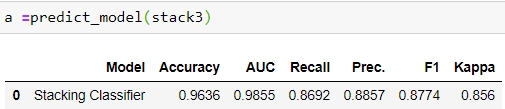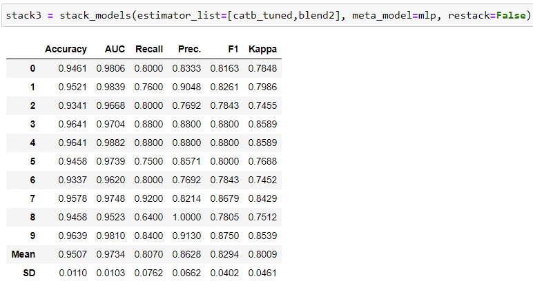 Stacking models is a method where we allow predictions of one models (or set of models) in one layer to be used as a feature for subsequent layers and finally, the meta-model is allowed to train on the predictions of previous layers and the original features (if restack=True) to make the final prediction. PyCaret has a very easy implementation of this where we can build a stack with one layer and one meta-model using stack_model() or multiple layers and one meta-model using create_stacknet(). I have used a different combination to build different stacks and evaluate performance.
