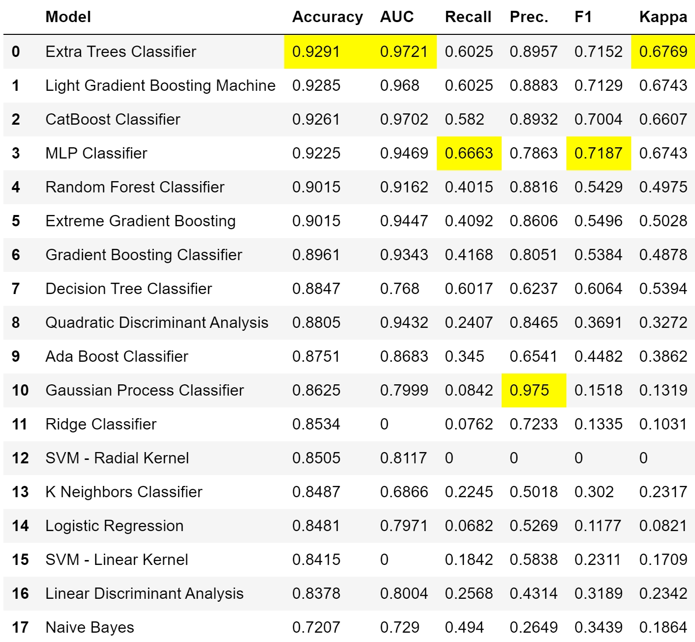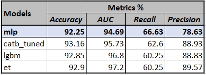 We will go ahead and create four models namely MLP Classifier (mlp), Extra-Tree Classifier (et), Cat Boost Classifier (catb) and Light Gradient Boosting Machine (lgbm) with best **Recall **and reasonable AUC/Precision.