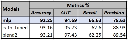 Though none of the models could dethrone ‘mlp’ from top position, it is very interesting to see the second blend, ‘blend2’, which is a soft combination of ‘lgbm’ and ‘et’. The performance on Recall and AUC of 62.25% and 97.43% is higher than both ‘lgbm’ and ‘et’ individually. This exhibits the benefit of blending models. Now our winner models would be reduced to 3.