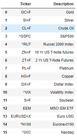 I have prepared a list of instruments for which we need to import data. yahoofinancials package requires Yahoo ticker symbols. The list contains the ticker symbols and their descriptions. The excel file containing the list can be found here with the name ‘Ticker List’ . We import that file and extract the ticker symbols and the names as separate lists. (*see notebook*)