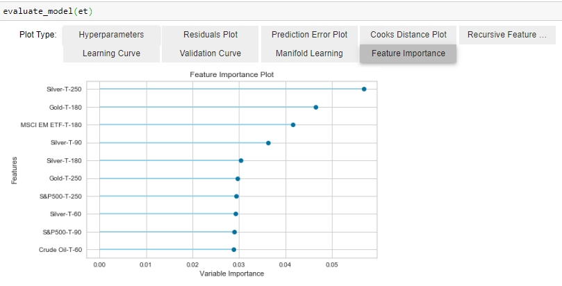We can use the same concepts and techniques for T+14 day prediction. The codes and output can be found in the Jupyter notebook titles “Gold Prediction Experiment Regression — PyCaret” in the repo here.