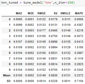PyCaret has a pre-defined grid for every algorithm and tune_model() function uses a randomized grid search to find the set of parameters that optimize the choice of metrics (Rsquare here) and displays the cross-validated score for the optimized model. It does not accept a trained model, and needs abbreviation of an estimator passed as string. We will tune Extra Tree (et), K Nearest Neighbors(knn) and CatBoost (catboost) regressors .